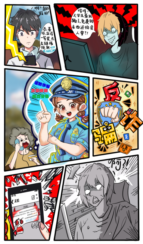 本次大赛作品紧扣“拆骗局、传知识、强意识”核心目标,内容针对校园高发的电信网络诈骗类型,呈现出三大鲜明特点:一是题材贴近校园生活,作品多聚焦“冒充电商客服退款”“虚假培训”“游戏账号交易诈骗”“校园贷陷阱”等师生高频遭遇的骗局;二是创意形式多元,传统手绘、电脑插画等多种表现手法;三是传递正向价值观,多数作品以“理性辨别”“主动举报”“守护财产”为核心。