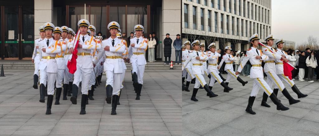 旗手们身着整洁正装,手持国旗迈着铿锵步伐入场。他们身姿挺拔、步履整齐,每一步都沉稳有力,目光坚定注视前方,在晨光中勾勒出昂扬轮廓。