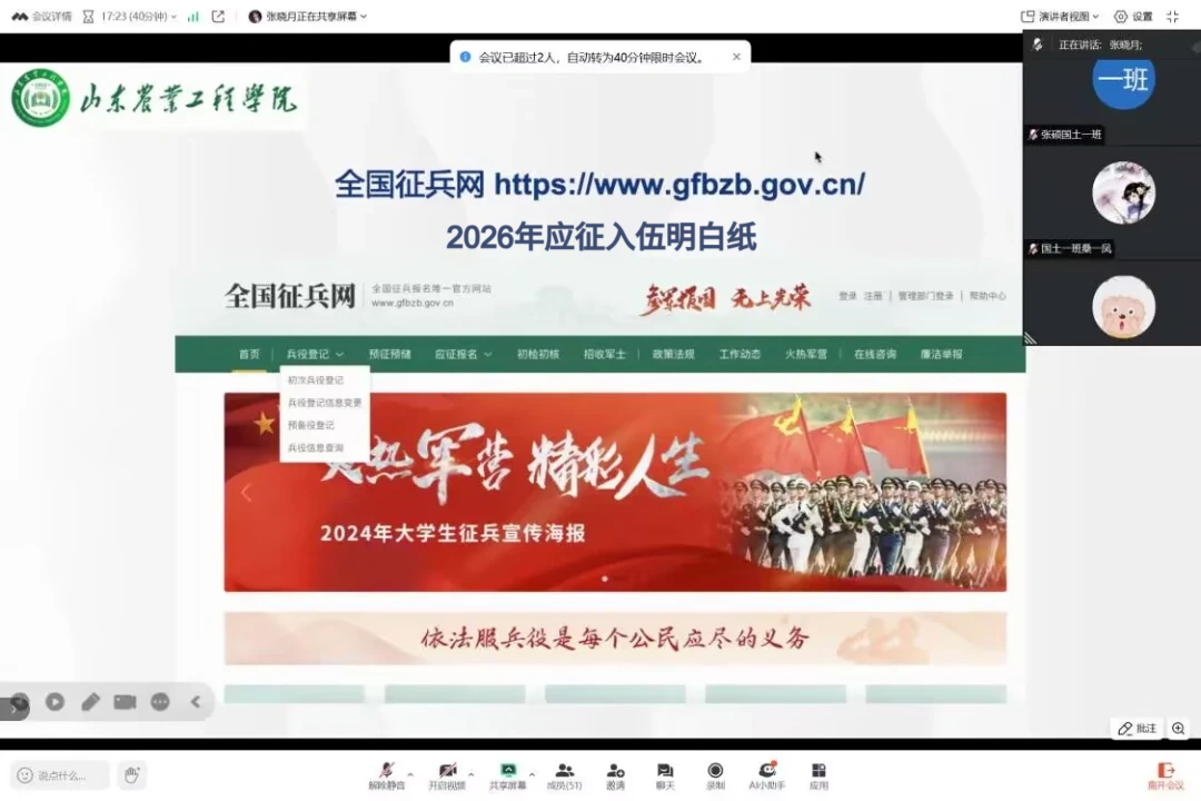 为深入贯彻落实习近平强军思想,加强国防后备力量建设,高质量推进我校征兵宣传工作,激发青年学子携笔从戎、参军报国热情,近日,国土资源与测绘工程学院精心组织、周密部署,通过主题班会、巡回宣讲会等多种形式,线上线下协同发力,在全院范围内开展征兵宣传教育工作。