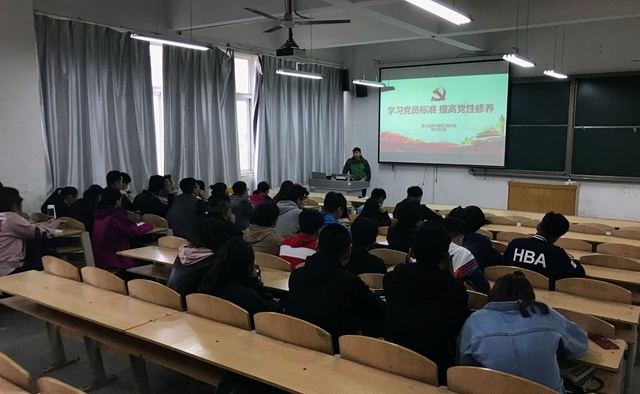 本次党课的主题为:“学习党员标准,提高党性修养”,徐老师首先从思考入党动机引入,细致讲解怎样端正入党态度,如何才能真正做到组织和思想上的真正入党。整个党课现场气氛浓厚,但不失活跃。在谈到入党动机时,徐老师一再强调“入党分子首先要端正入党动机,树立为人民服务的理念,将集体利益放在首位”。之后结合先进党员事例依次从关于党员义务与权利、如何坚持和实践党员标准以及发展党员程序等方面为学生介绍了入党方面的知识,使学生们统一了思想,提高对入党的认识,增强对党情的了解。