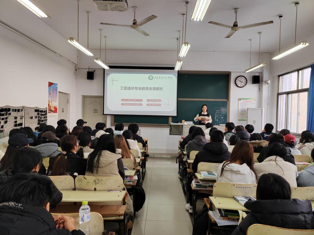 报告会上,李伟从学校概况、学院概况及专业介绍展开,着重阐述了道路工程造价-工程造价“3+2”专本贯通专业的培养目标:培养理论与实操兼备的高级应用型人才。在就业方向上,她为学生梳理了体制内、造价咨询单位、建设单位、施工单位等多元路径,鼓励学生培养复合能力以增强个人竞争力,同时激励有志于深造的同学树立考研的远大目标。此外,她还提及学科竞赛与社团活动,为学生提升专业技能搭建平台。