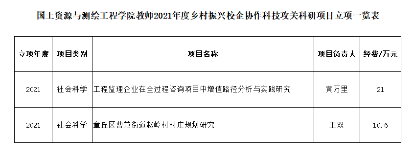 国土资源与测绘工程学院教师2021年度乡村振兴校企协作科技攻关科研项目立项一览表