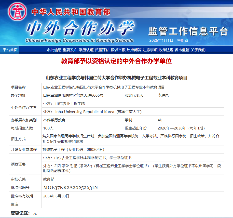 近日,我校与韩国仁荷大学合作举办的机械电子工程专业本科教育项目成功获得教育部审批通过。这是我校继环境生态工程专业后,获批的第二个本科层次中外合作办学项目,标志着学校在国际化办学方面实现新的突破。