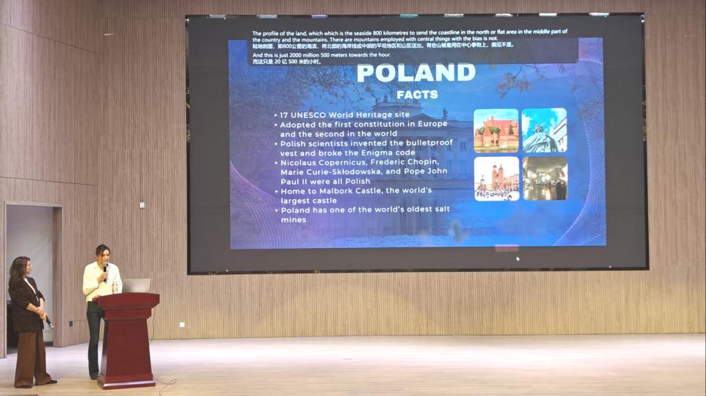 随后,波兰奥波莱技术大学校方代表Julietta与MargotJaga依次发言。Julietta重点介绍了其负责的“中波合作项目课程衔接与教学质量把控”工作,详细说明外方课程对国内知识点的承接逻辑;MargotJaga则聚焦国际学生服务,明确其负责的招生咨询、签证协助、赴波后适应指导等工作范畴,承诺为学生深造提供全流程支持。两位代表还通过图片、短视频等形式,直观展示了奥波莱技术大学的校园环境、实验室资源及国际学生社群活动。在答疑环节,现场学生举手踊跃,围绕“赴波后专业课程与国内学分的互认细则”“环境生态领域校企合作实践项目申请条件”“国际学生住宿类型及生活补贴申领流程”等关键问题展开咨询,校方代表结合实际案例逐一细致解答,现场氛围热烈。