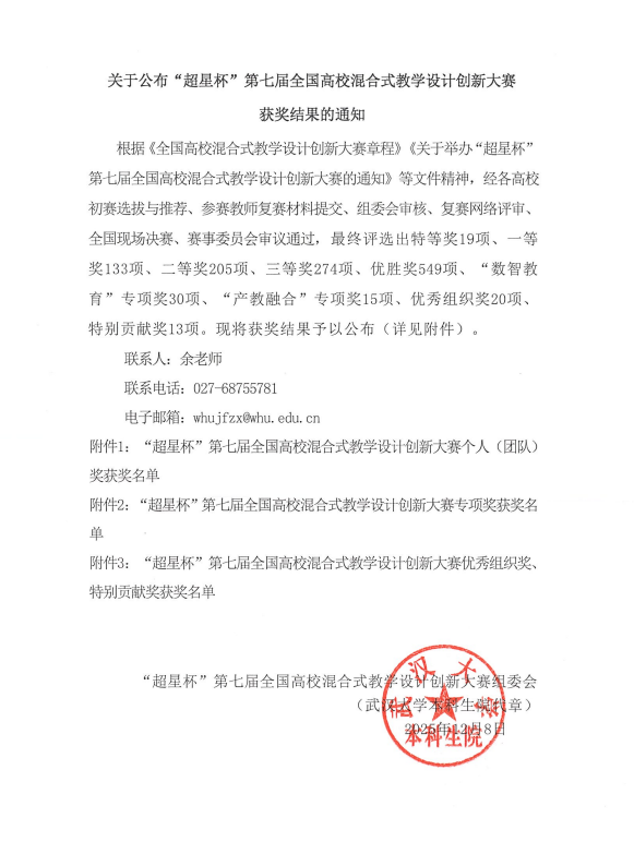 近年来,学校持续推进混合式教学改革,通过教师培训、平台支持与机制建设,鼓励教师开展教学创新,提升课程质量。学校将以此次赛事为契机,进一步总结推广优秀教学经验,健全教师教学发展支持体系,持续推动教育教学改革,为全面提升人才培养质量、推动高等教育内涵式发展注入新的动力。