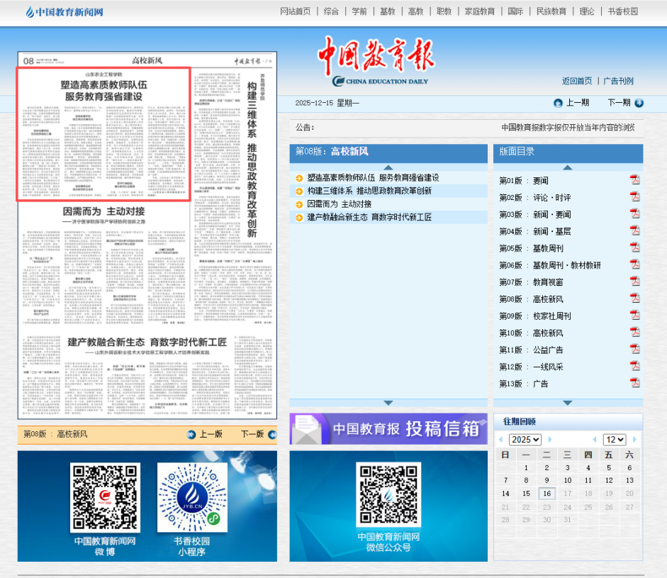 2025年全职引进国家级高层次人才1名,泰山产业领军人才2名,柔性引进省级重点人才工程人员3人。1人获评山东省农业强省先进个人,1人荣获2024年度山东省政府特殊津贴。引进博士教师62人,培育博士教师9人。新增“双师型”教师52人,占比达到51.1%。5月28日,山东省教育厅网站“战线联播”选发《“五个坚持”强化教师队伍建设》经验。坚持以教育家精神铸魂强师,健全完善师德师风建设长效机制,制定《落实师德师风建设主体责任实施办法(试行)》、修订《教师师德失范行为处理办法》、绩效工资办法等,完善人才激励政策,培养造就高素质教师队伍。12月15日,《中国教育报》刊发学校建设高素质教师队伍工作经验《塑造高素质教师队伍 服务教育强省建设》。我校教师在第十五届全国运动会斩获铜牌。