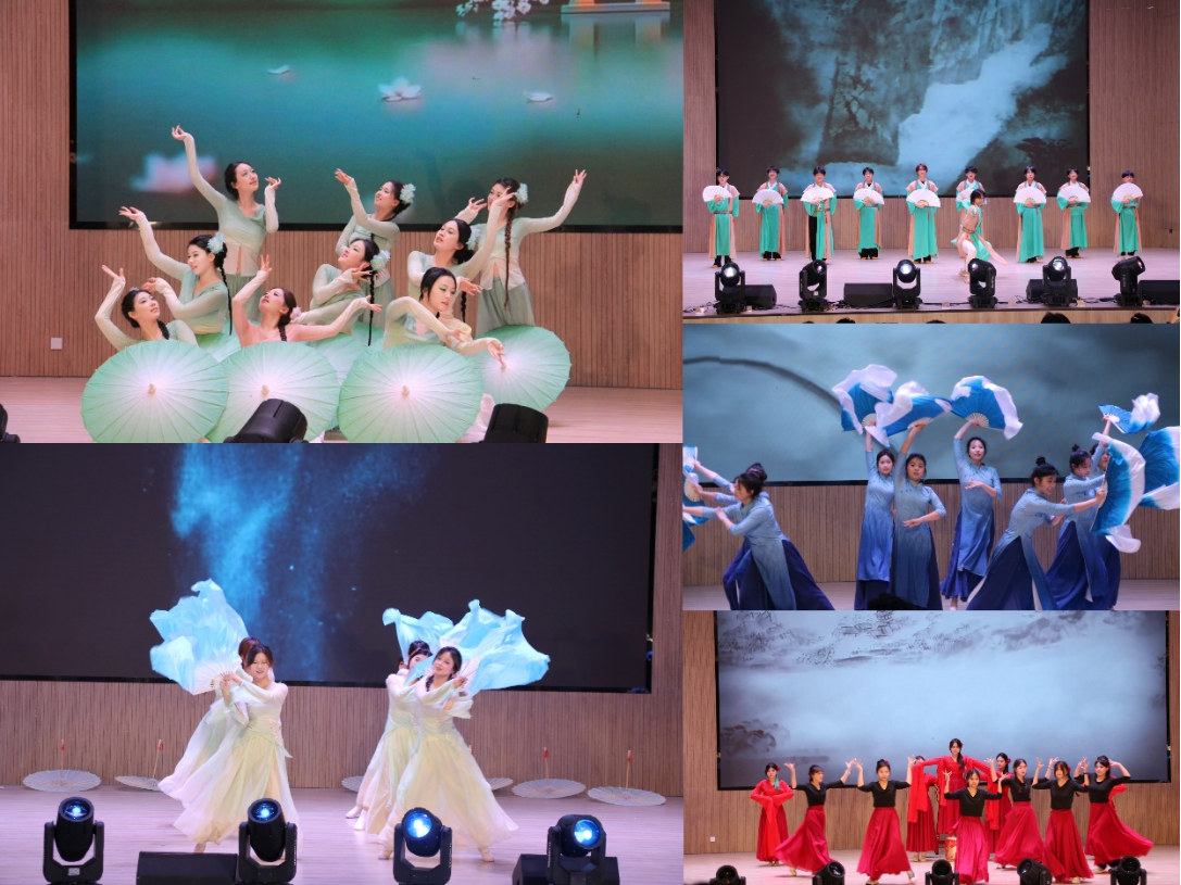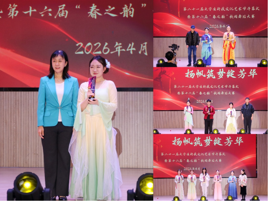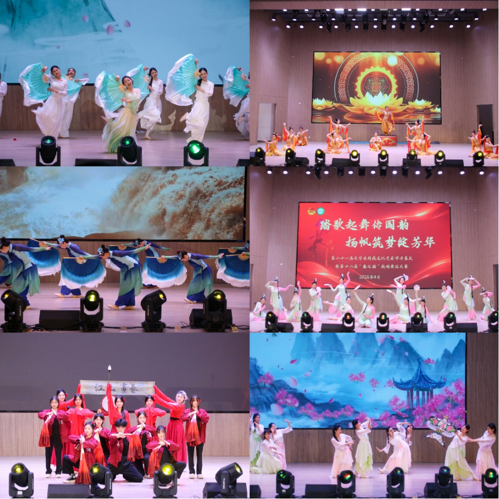 第十六届“春之韵”校园舞蹈大赛以“国风承韵”为主题,来自二级学院11支代表队同台竞技,将中华优秀传统文化、红色革命精神与现代舞蹈艺术深度交融,为现场观众献上一场震撼心灵的视听盛宴。《水龙吟》《梦敦煌》《画中游》《听夜雨》等作品,以翩跹的水袖和曼妙的身段,生动勾勒出古典意象的诗意与空灵;《淡妆浓抹总相宜》《鸢影寻春》《纸扇书生》《立春》等节目,在举手投足间尽展国风雅韵,传递出深厚的历史底蕴;《一条大河》则以饱含深情的肢体语言,将浓烈的家国情怀娓娓道来。青年舞者们用灵动的足尖,生动演绎了一堂“沉浸式”的美育思政课,赢得了现场师生的阵阵掌声。