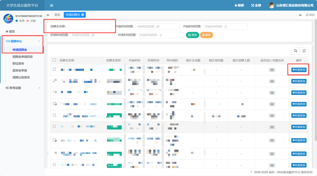 第二步:单位登录系统后(新注册单位由学校审核通过方能申请),点击左侧招聘中心→申请招聘会→搜索“职引未来 就选山东”山东农业工程学院2026届毕业生就业暨2027届毕业生实习春季双选会→点击右侧申请参加。