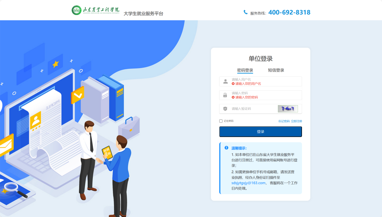 第一步:通过山东农业工程学院大学生就业服务平台注册登录(如在本单位已在山东省大学生就业服务平台进行注册过,可直接使用省网账号进行登录),链接如下:https://school.gxjy.sdei.edu.cn/sdaeu