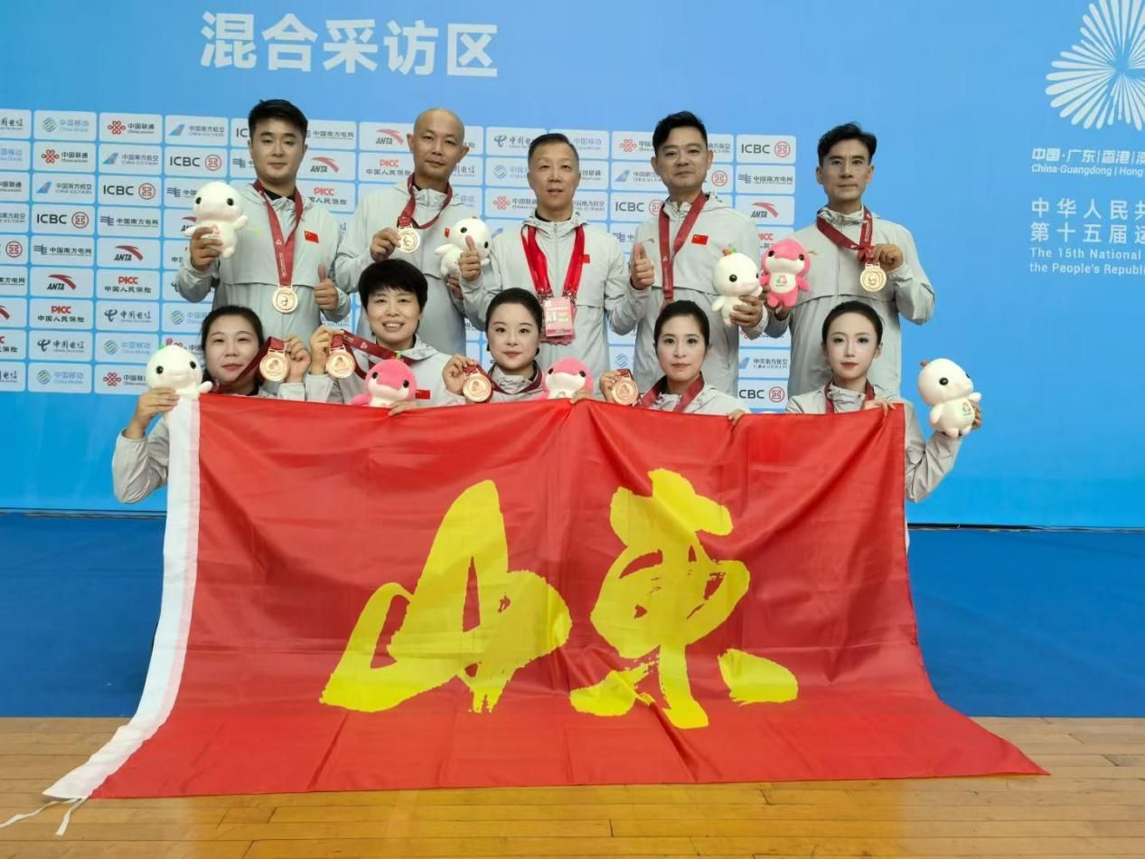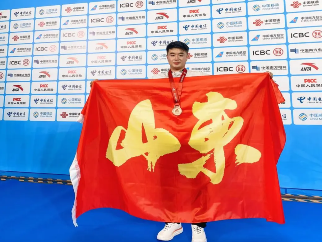 我校基础课教学部教师闫凯经过两个多月的刻苦训练,入选山东队出征此次大赛。在三十二式太极剑项目比赛中,闫凯将太极“刚柔并济、行云流水”的精髓融入每一招式之中,动作舒展大气、精准到位,兼具韵律感与规范性,既彰显出太极深厚的文化底蕴,也契合现代体育竞技的严谨要求,凭借扎实功底与稳定发挥斩获铜牌。