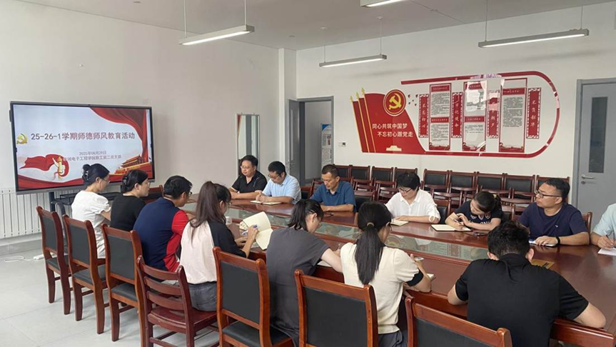 为深入贯彻落实立德树人的根本任务,切实强化教师队伍的师德师风建设,2025年8月29日,机械电子工程学院教工第二党支部组织电气教研室全体教师,开展2025 - 2026学年第一学期师德师风教育学习活动。该活动采用专题学习、案例研讨与承诺践诺相结合的形式,旨在筑牢教师的思想道德根基。