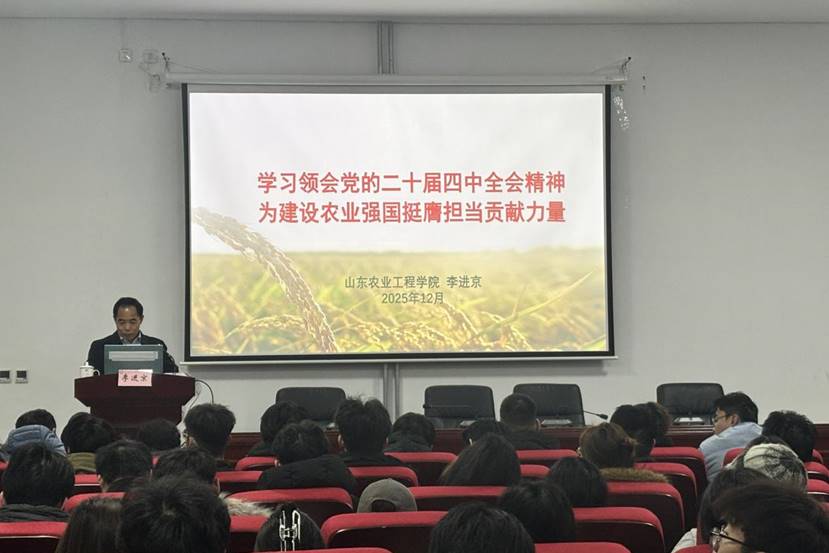 为深化理论学习,筑牢思想根基,2025年12月2日,党委副书记、校长李进京在理工西楼B103为百余名师生精心讲授了一堂题为“学习领会党的二十届四中全会精神,为建设农业强国挺膺担当贡献力量”的形势与政策课。