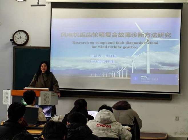 孔晓佳是机械工程专业博士、淄博市高层次人才,长期从事风电机组故障诊断、信号处理技术及智能控制等领域研究,主持参与多项国家及省级自然科学基金项目,发表高水平论文20余篇。讲座中,她结合自身科研成果,系统介绍了齿轮箱复合故障诊断的前沿方法与工程应用,为在场师生提供了宝贵的学术参考。