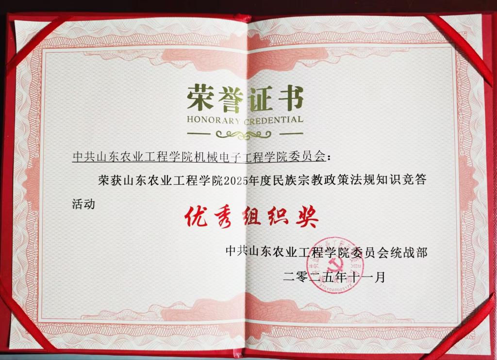 为深入学习宣传党的民族宗教政策与国家相关法律法规,切实提升师生对民族宗教政策法规的知晓度与认同感。根据学校党委统战部发布的关于开展2025年度民族宗教政策法规知识竞答活动的通知要求,机械电子工程学院积极组织师生踊跃参与,凭借高参与度、高正确率的优异表现,被活动主办方授予“优秀组织单位”荣誉称号。