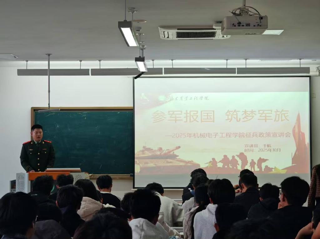 10月8日,机械电子工程学院面向2025级新生举办了一场征兵宣讲活动。2025级电气专升本1班的退役士兵于航同学担任主讲,他以自身军旅经历为素材,向新生们分享了真实的军营生活与成长感悟,并解读了大学生征兵的相关政策。