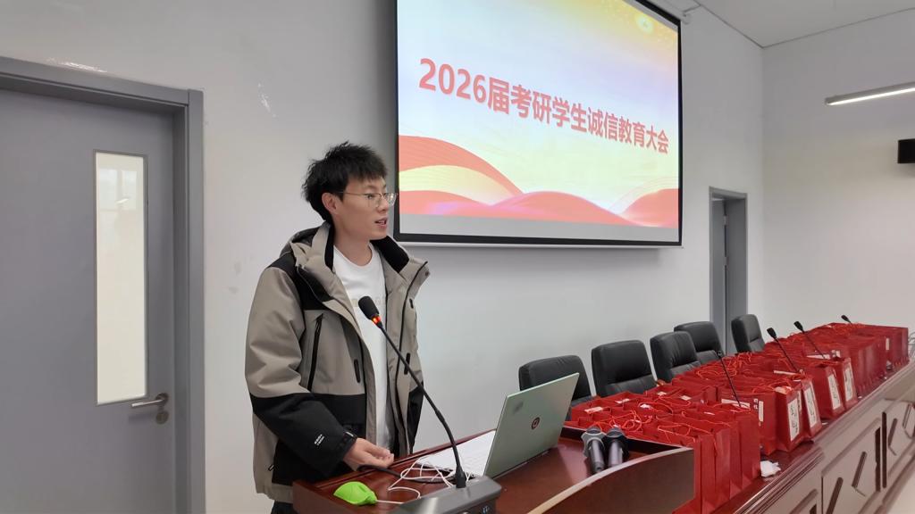 随后,辅导员胡晓龙为2026届考研学生开展诚信教育大会。胡老师结合真实案例警示考生严守考试纪律,强调诚信是立身之本,要求全体考生以诚信态度对待考试,杜绝任何形式的作弊行为。