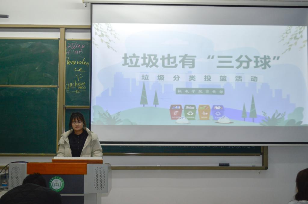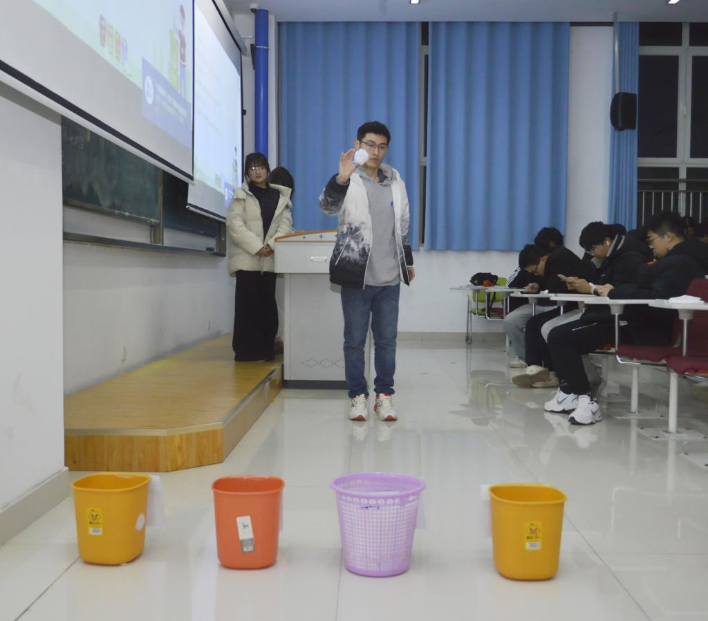 为弘扬绿色环保理念,提升同学们的环保实践能力,营造整洁文明、趣味盎然的校园环境,机械电子工程学院于3月20日在淄公北楼A102教室开展“垃圾也有‘三分球’”垃圾分类投篮活动。本次活动由我院学生会宣传部承办。