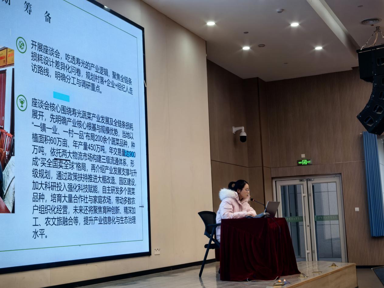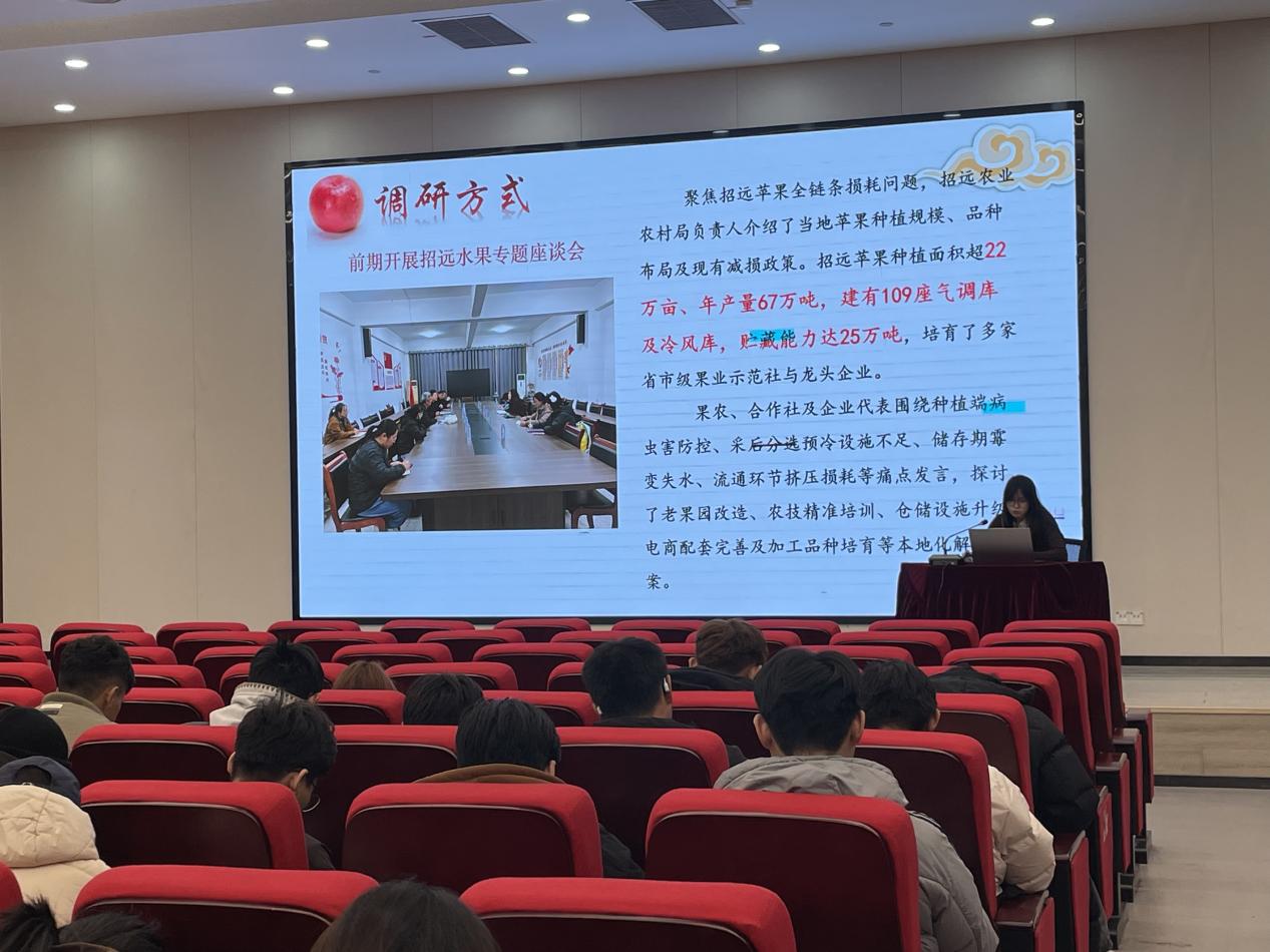 在各小组调研汇报环节,三支调研小组分别围绕各自调研区域的特色产业展开汇报。汇报中,各小组通过问卷数据、访谈实录等鲜活素材,清晰呈现了调研过程,并结合专业知识提出了针对性的减损建议,充分展现了农林经济管理专业学生的专业素养与责任担当。