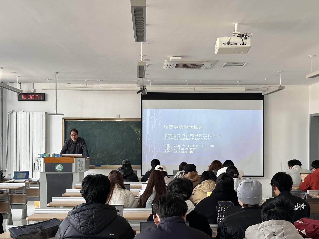 2025年11月24日上午,在淄公南楼B403教室22级物流工程专业学生聆听经管学院常乐副教授主讲的“学术论文与开题报告写作入门”专题报告。报告紧扣班级课程论文与毕业设计需求,聚焦学术写作痛点提供系统指导。