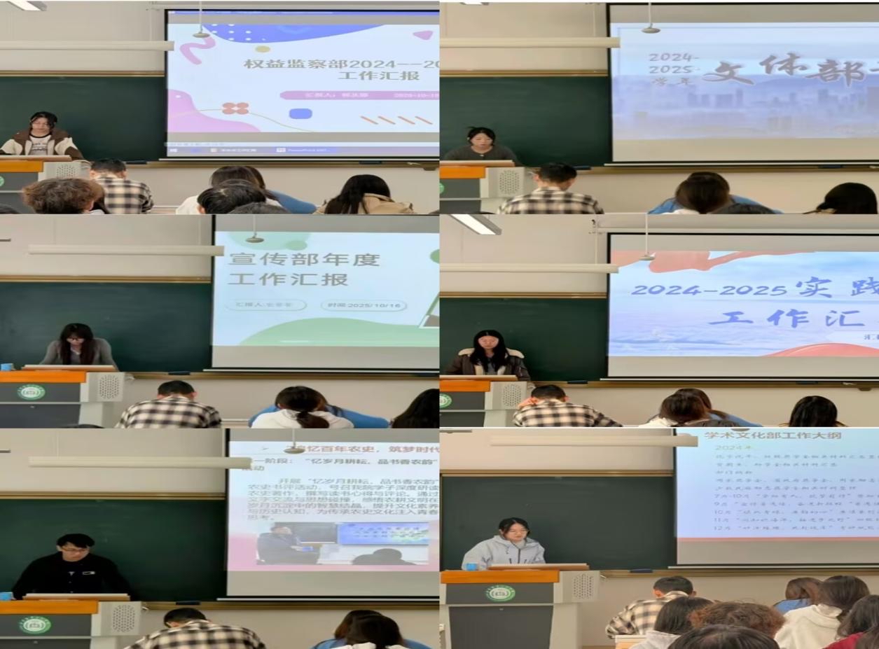 随后,各部门成员进行个人工作汇报,成员们围绕上一学年的具体工作内容,阐述了在各项任务中发挥的作用,同时分享了参与工作过程中获得的能力提升与认知成长,鲜明展现出自身在学生会工作里的付出与蜕变。
