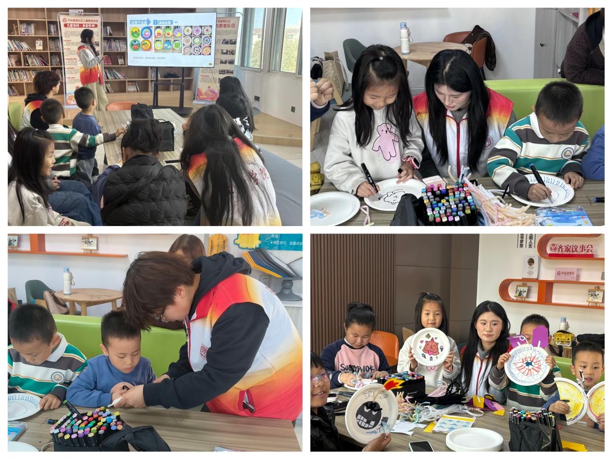 活动伊始,志愿者们通过组织趣味小游戏与孩子们互动,活跃了现场氛围,激发了孩子们的热情。随后,志愿者通过PPT向孩子们展示了多种多样的盘子画作品,并对复杂图案的制作步骤进行讲解。在实践环节,志愿者进行一对一指导,帮助孩子们用画笔、剪刀和扭扭棒进行创作。转眼间,一个个白色纸盘,在稚嫩而又灵巧的小手中变成了独一无二的盘子画艺术品。