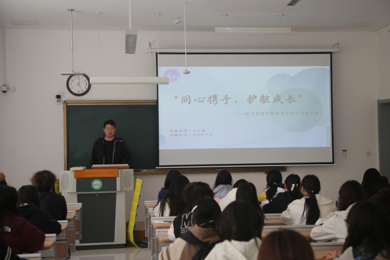 2025年11月5日,经济管理学院在淄博校区文法西楼B105教室召开“同心携手,护航成长”权益保障委员培训会,我院思想政治辅导员王永瑞出席本次会议。