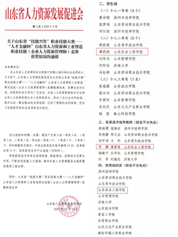 2025年12月5日,山东省“技能兴鲁”职业技能大赛——“人才金融杯”山东省人力资源和工业智造职业技能竞赛在滨州技师学院成功举办。经过激烈的角逐,我院2023级农林经济管理(公费)班谭莉纳同学荣获本次比赛的二等奖,我校获优秀组织奖。