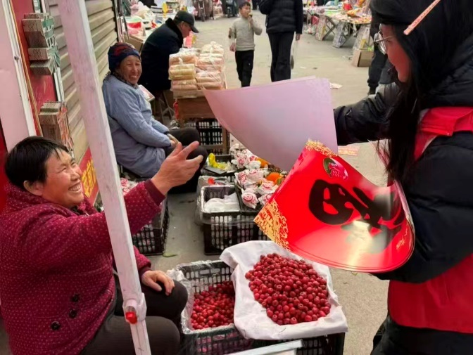 另一边,韩雪迎同学投身家乡基层政务实践,以严谨态度深耕岗位。实践期间,她协助工作人员整理档案资料、核对录入数据,将细致耐心融入政务工作细节;在政务服务窗口,她热情接待办事群众,耐心解答社保等民生政策疑问,用专业服务搭建起政务与群众的“暖心桥”。此外,她还发挥特长开展多元服务:春节前为社区居民送福送春联,走进社区宣讲防火、反诈等安全知识,拍摄制作家乡宣传视频,用镜头展现家乡发展变迁,让更多人看见家乡美好。