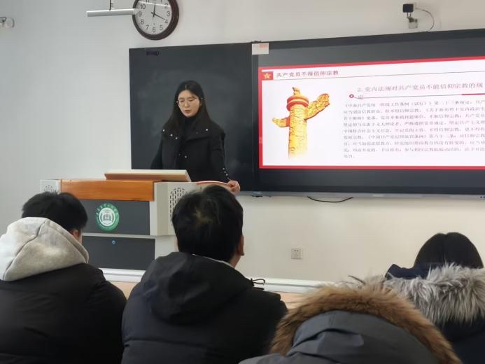 活动中,学生第二党支部书记刘文娟同志从马克思主义宗教观切入,系统解读新时代党的宗教工作基本方针,结合高校实际案例阐释“坚持我国宗教中国化方向”的实践要求,明确“教育与宗教相分离”的原则,同时梳理非法宗教渗透的常见形式与防范要点,引导党员认清宗教与信仰的界限,增强风险防范的思想自觉。