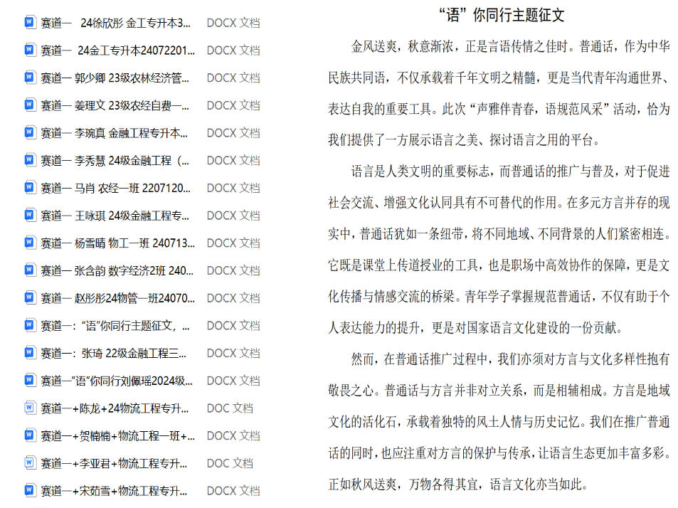 在“语”你同行主题征文活动中,共征集作品110余篇,同学们结合自身经历与秋日感悟,用规范生动的语言传递秋意。同学们也在文章观点阐述中分享了普通话的学习心得,讲述用标准语言沟通带来的成长,展现出了良好的语言素养与青春风貌。在微视频创作活动中,同学们自行创作脚本、演绎剧情,通过校园生活场景再现、方言与普通话对比趣味演绎,生动展现了普通话在沟通交流中的重要作用。
