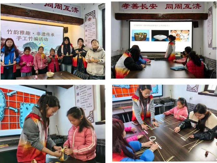 在活动过程中,志愿者们首先为孩子们讲解了竹编的历史背景与实用价值,并详细介绍了穿、绕、编、结等基础编织技巧,带领孩子们初步认识这项传统手工艺。随后,在志愿者的现场指导下,孩子们按照讲解步骤逐步动手尝试。小朋友们参与热情高涨,专注投入于编织实践中,整个场面忙碌而温馨,充满了探索的乐趣与初获成功的成就感。