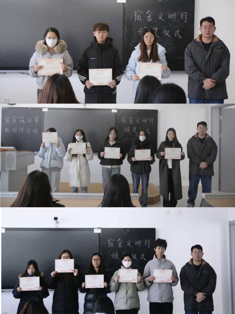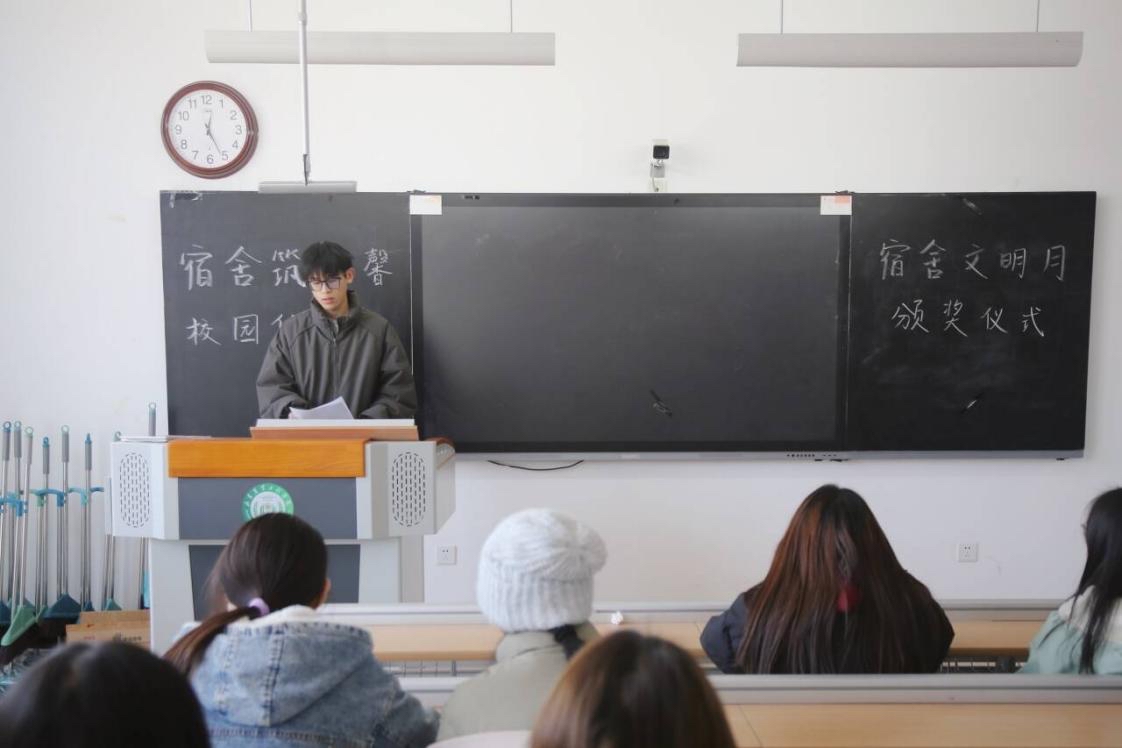 在此次宿舍卫生安全文明月活动中,同学们踊跃参与,齐心营造整洁、安全、文明的宿舍环境。经多轮选拔,共选出模范文明寝室(一等奖)3个、四星示范寝室(二等奖)6个、文明先锋寝室(三等奖)9个、温馨和谐寝室(优秀奖)5个。这些宿舍不仅在卫生上做到干净整洁,更在遵守宿舍安全、打造文明氛围方面作出榜样。在颁奖环节中,王永瑞老师为获奖宿舍颁发荣誉证书,以此鼓励大家在活动中展现出的优良风貌,更以其为范例,激励同学们在以后继续保持良好的生活习惯,让宿舍成为每个人的温馨小家。