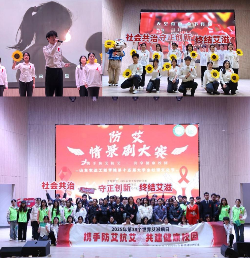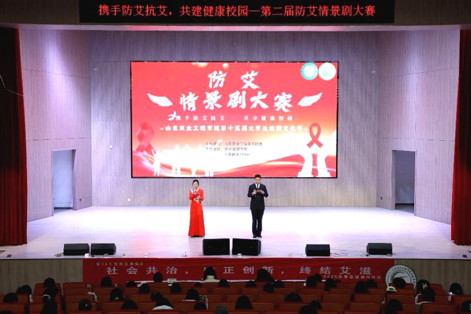 为进一步普及艾滋病防治知识,增强青年学生的自我保护意识与社会责任感,持续推进校园防艾宣传品牌影响力,12月4日,由校团委主办、经济管理学院青春健康同伴社承办的第十五届大学生社团文化节活动——“社会共治,守正创新,终结艾滋”防艾校园情景剧大赛决赛在淄博校区大学生活动中心隆重举行。校团委老师孙迪暄、校医院医师孔艳红、青春健康同伴社指导教师张娟、 经济管理学院辅导员宋一诺担任评委,300余名学生到场观看,以沉浸式体验让科学防艾理念与人文关怀深度交融。
