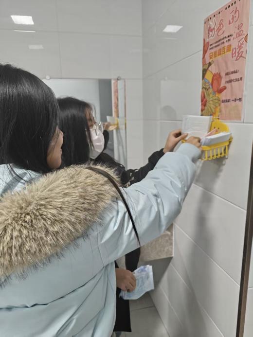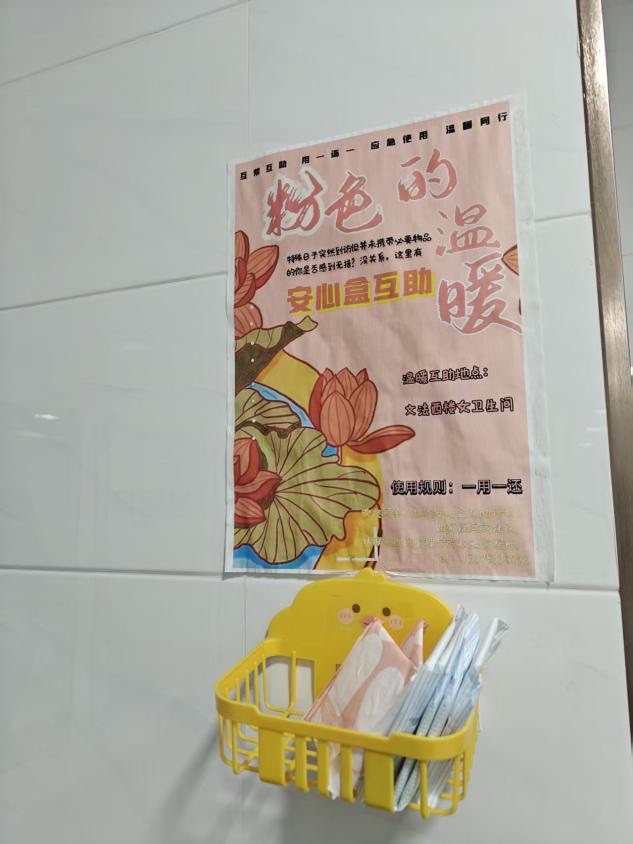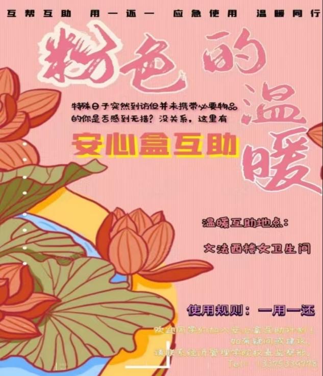 本次活动将延续“办实事、暖人心”的核心理念,文法西楼各层指定区域均张贴温馨提示海报,旁侧互助盒内备有干净安全的卫生巾。为有需要的同学提供即时保障。本着“一用一还”原则,让善意持续流传。同时,我院会提前完成互助盒清洁消毒和物资补充,定期检查互助盒情况,及时补充更换。为了让活动更完善、更贴合需求,同学们可通过海报上的联系方式进行咨询或给予建议,让活动在师生监督中不断完善。