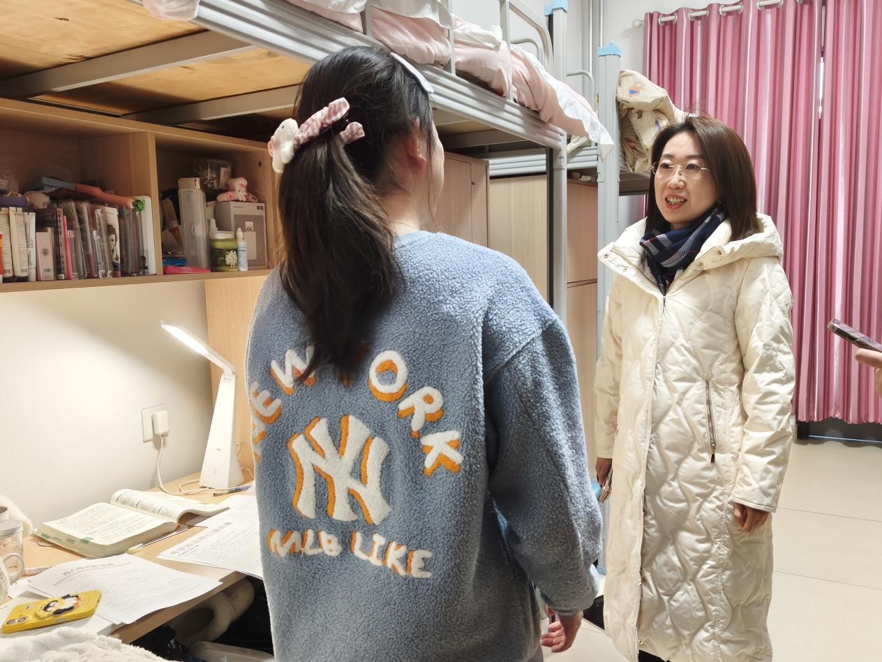 为进一步深入了解学生校园生活,倾听学生真实诉求,2025年12月5日,经济管理学院曲文俏院长和思想政治辅导员李娜走进女生宿舍,开展了一场温馨而细致的走访活动。