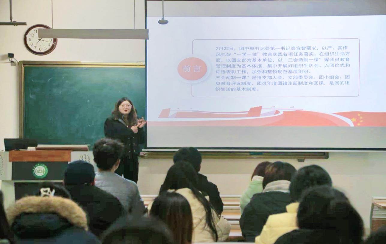 会议伊始,李娜老师紧扣本学期团学工作部署,围绕“三会两制一课”展开系统讲解,明确了团支书在统筹支部建设、落实团务工作、引领团员思想、服务同学成长中的核心职责。她强调,“三会两制一课”是团组织凝聚青年、开展工作的根本遵循,更是夯实基层组织力的关键抓手。同时要求团支书将制度规范与支部实际深度融合,以精准化部署、常态化落实、实效化推进为原则开展工作。这一制度体系的深入解读,不仅为团支书提供了清晰的工作指引,更彰显了团组织以思想引领为核心、以服务青年为导向的建设理念。