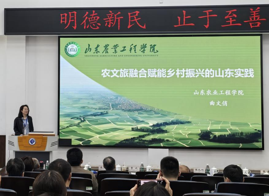 曲文俏院长做为此次大会的特邀专家,做了题为《农文旅融合赋能乡村振兴的山东实践》的主旨演讲。她用数据展示了山东乡村旅游成效:截至2024年底,全省规模化乡村旅游村庄超3500个,直接吸纳就业58万余人,农户人均年增收300元以上。她还分享了“黄河大集”、临沂沂南红色文旅、淄博红叶柿岩、泰安九女峰等典型案例,生动诠释了“乡土根脉+集市活化”“文化灵魂+非遗活化”“生态基底+昼夜联游”等多元模式。曲院长的演讲既有理论高度又有实践深度,获得与会专家一致好评,充分展示了我院在乡村振兴领域的研究实力与社会影响力。