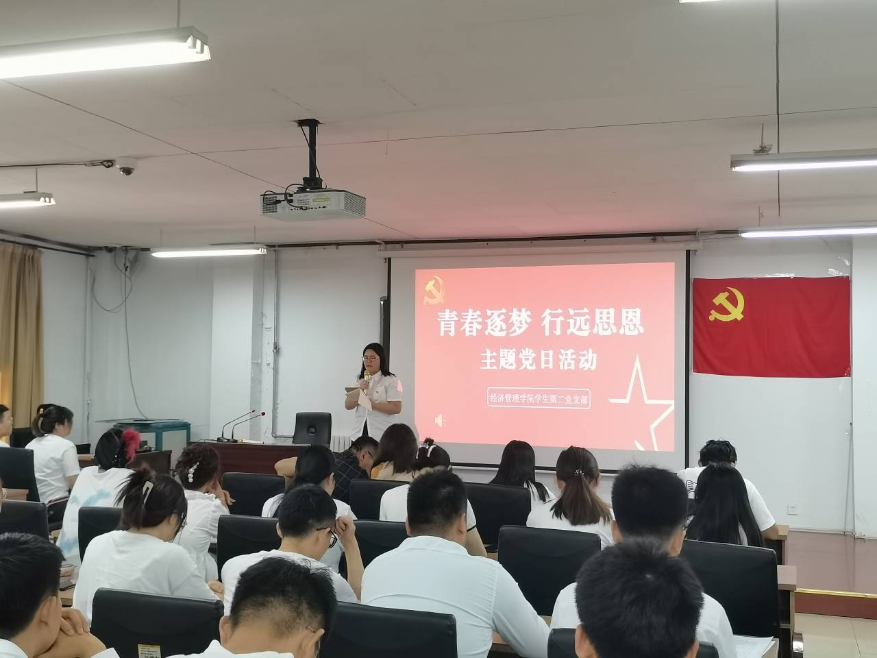 6月28日,经济管理学院学生第二党支部在齐河校区培训楼五楼会议室开展主题为“青春逐梦,行远思恩”主题党日活动。经济管理学院党总支副书记杜锋、支部纪检委员张娟、支部宣传委员曹奇、刘文烨老师及学生支部全体党员参加,活动由经济管理学院学生第二党支部组织委员李娜主持,。