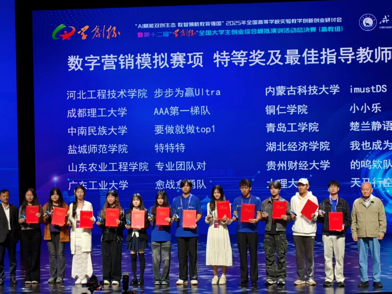 作为全国高校创新创业领域的重要赛事,“学创杯” 每年吸引超过1500所高校、百万余名师生参与,是衡量高校创新创业教育成效的核心指标性竞赛之一。本届大赛设置创业综合模拟赛、数字营销模拟赛、财务决策综合模拟赛等多个赛道,全面考察参赛团队的商业策划、市场分析、战略决策及团队协作能力。我校高度重视赛事组织工作,从校内选拔到专项培育,组建由经济管理学院骨干教师组成的指导团队,开展沙盘演练与方案打磨,最终在全国众多参赛队伍中突围,斩获双赛道特等奖,创下学校在该赛事中的历史最佳成绩。
