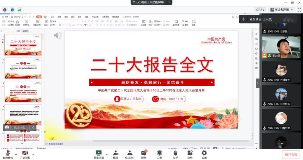 2022年11月29日,经济管理学院党总支书记颜素杰通过腾讯会议为20级金融工程专业、经管专业、物管专业213名同学做《党的二十大精神解读》,政治辅导员王太然通过腾讯会议为20级物流工程专业65名同学宣讲了党的二十大精神,政治辅导员李娜通过腾讯会议为20级农林经济管理专业70名同学作了题为“坚定文化自信,凝聚民族复兴的精神力量”的报告。
