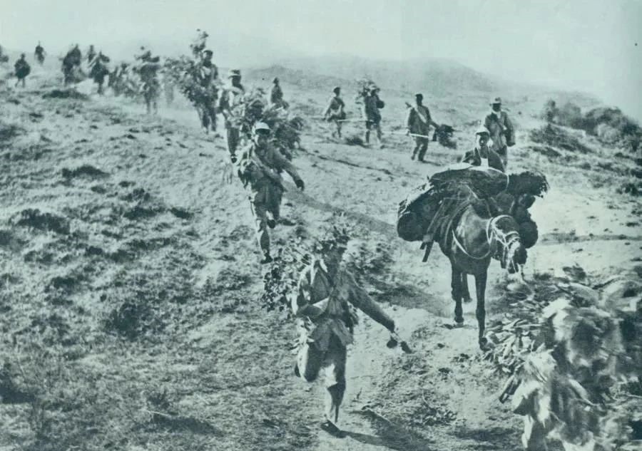 图为1947年5月在孟良崮战役中,华东野战军向孟良崮挺进。