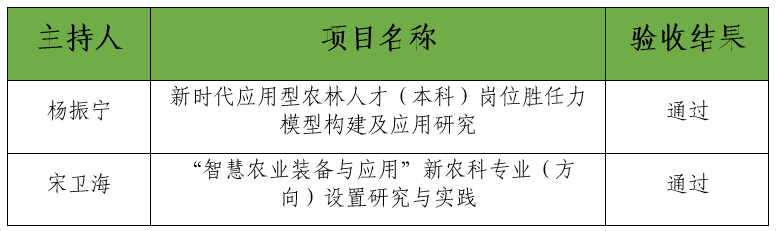 近日,教育部办公厅公布了新农科研究与改革实践项目结题验收结果,我校杨振宁教授主持的“新时代应用型农林人才(本科)岗位胜任力模型构建及应用研究”项目和宋卫海教授主持的“‘智慧农业装备与应用’新农科专业(方向)设置研究与实践”项目顺利通过验收。
