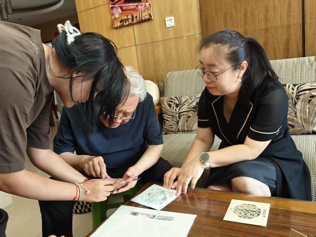 在双向互动的过程中,青银携手共同制作了拓印“红心向党”和“非遗宋锦珍珠画”等手工制品,并互赠时代寄语卡片。两张卡片在代际的期许和承诺中,架起精神传承的桥梁。“手工制作+思想对话”的沉浸式教育,使红色精神从抽象理念转化为可触可感的实践认知。