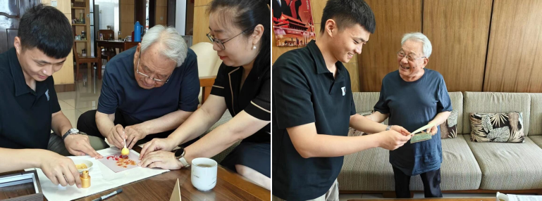 青银携手,共绘未来。同学们与马老一起制作了拓印“红心向党”和“非遗宋锦珍珠画”等手工制品,并互赠时代寄语卡片。马老叮嘱大家,红色信仰不仅要印在心里,更要落在行动上。师生们共同向马老送上祝福,并承诺要牢记嘱托,坚守初心,干好本职工作,在新征程上挺膺担当。