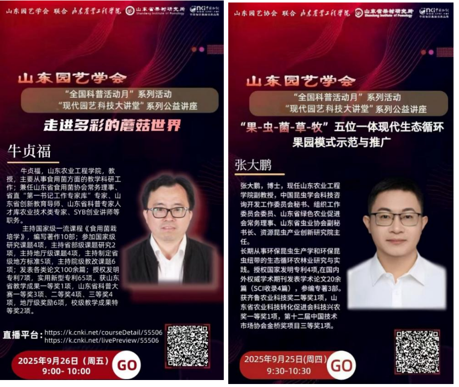 为贯彻落实中国科协、科技部等六部门《全民科学素质纲要实施工作办公室关于广泛开展首个全国科普月活动的通知》精神,山东园艺学会于9月推出“全国科普月·现代园艺科技大讲堂”系列公益讲座。9月25和26日,我院牛贞福教授、张大鹏副教授应邀开展科普讲座,本次讲座通过中国知网知农云课堂平台直播,吸引600余位高校师生、园艺工作者在线观看。