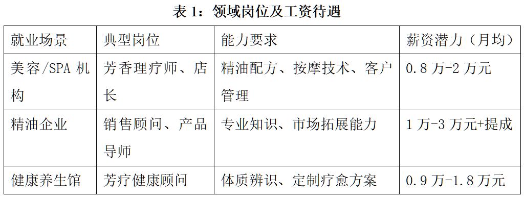 从就业前景方面分析,芳香疗愈师的具体就业方向:可以在芳香SPA馆、美容美体中心工作;成为芳香疗法培训讲师;在商场或专柜做精油销售顾问;进入大型精油公司成为精油导师;自主创业开设芳香工作室等。持证芳香疗愈师可在美容院、芳香SPA馆、大型精油公司等场所就业。表1