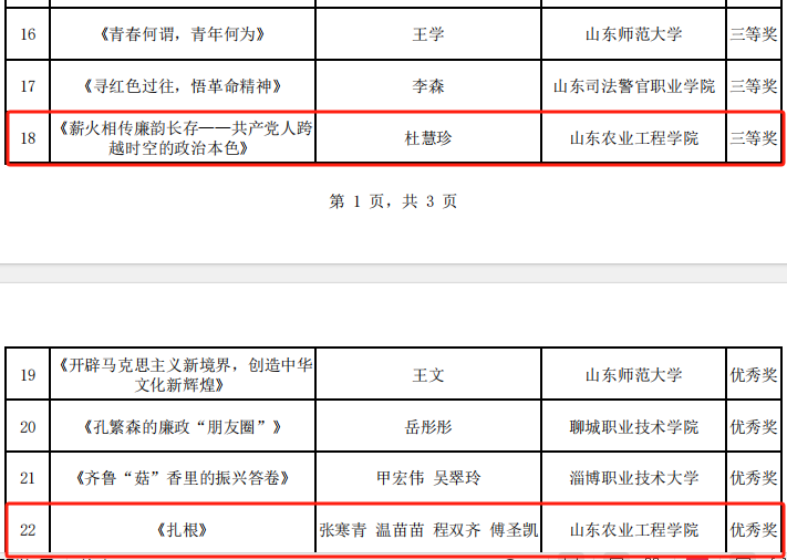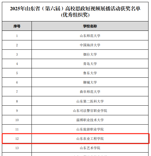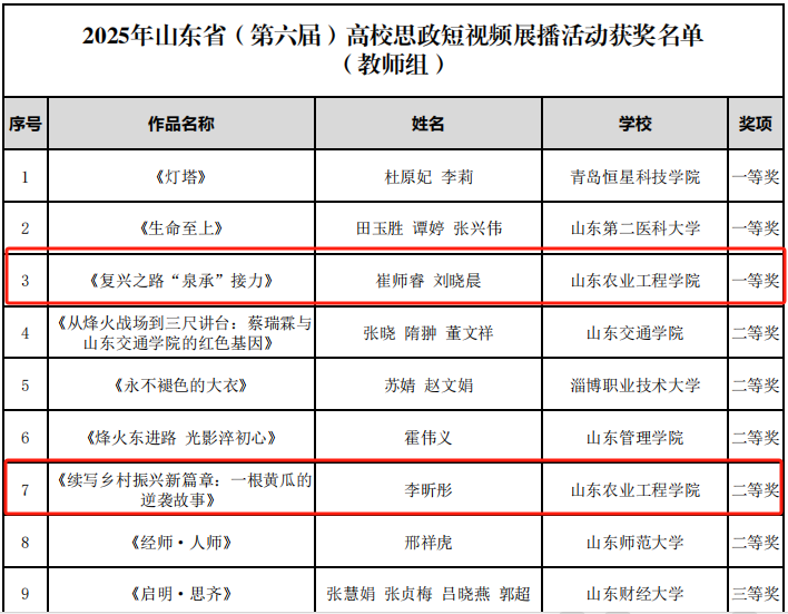 近日,由省委宣传部指导,大众报业集团(大众日报社)、山东省广播电视局共同主办的2025年山东省(第六届)高校思政短视频展播活动获奖结果公布,我院报送的思政短视频作品荣获省级奖项教师组一等奖1项、二等奖1项、三等奖1项、优秀奖1项,包揽教师组全部等次奖项,学校荣获“优秀组织奖”。