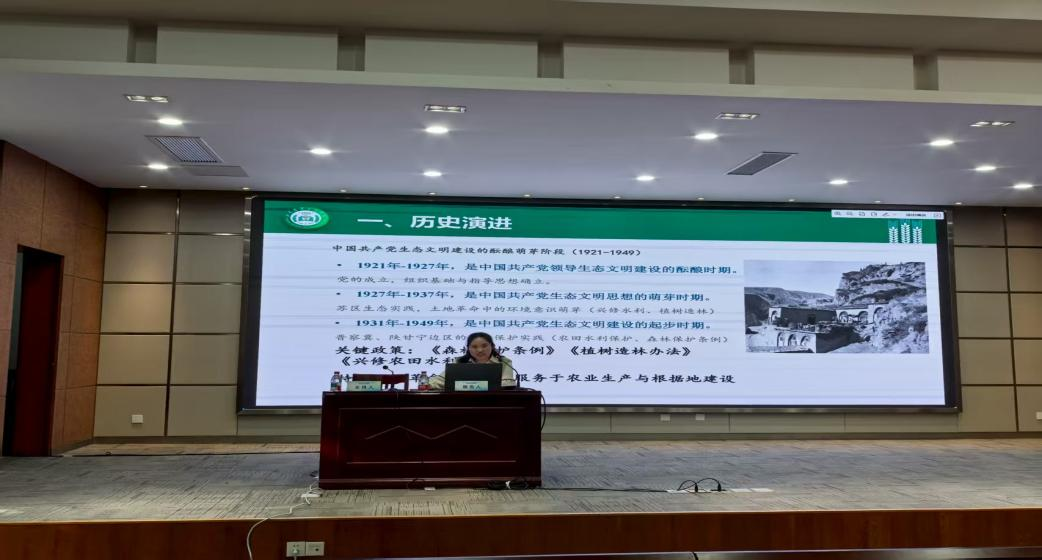 我院教师赵璐作了《中国共产党生态文明建设的历史演进与内在逻辑》的发言,从酝酿萌芽、探索调适、巩固求进、创新发展四个历史阶段梳理了中国共产党领导生态文明建设的历史演进,分析了其蕴含的理论、价值、实践、战略四重内在逻辑,并提出了新时代推进生态文明建设、实现人与自然和谐共生的现代化的实践路径。