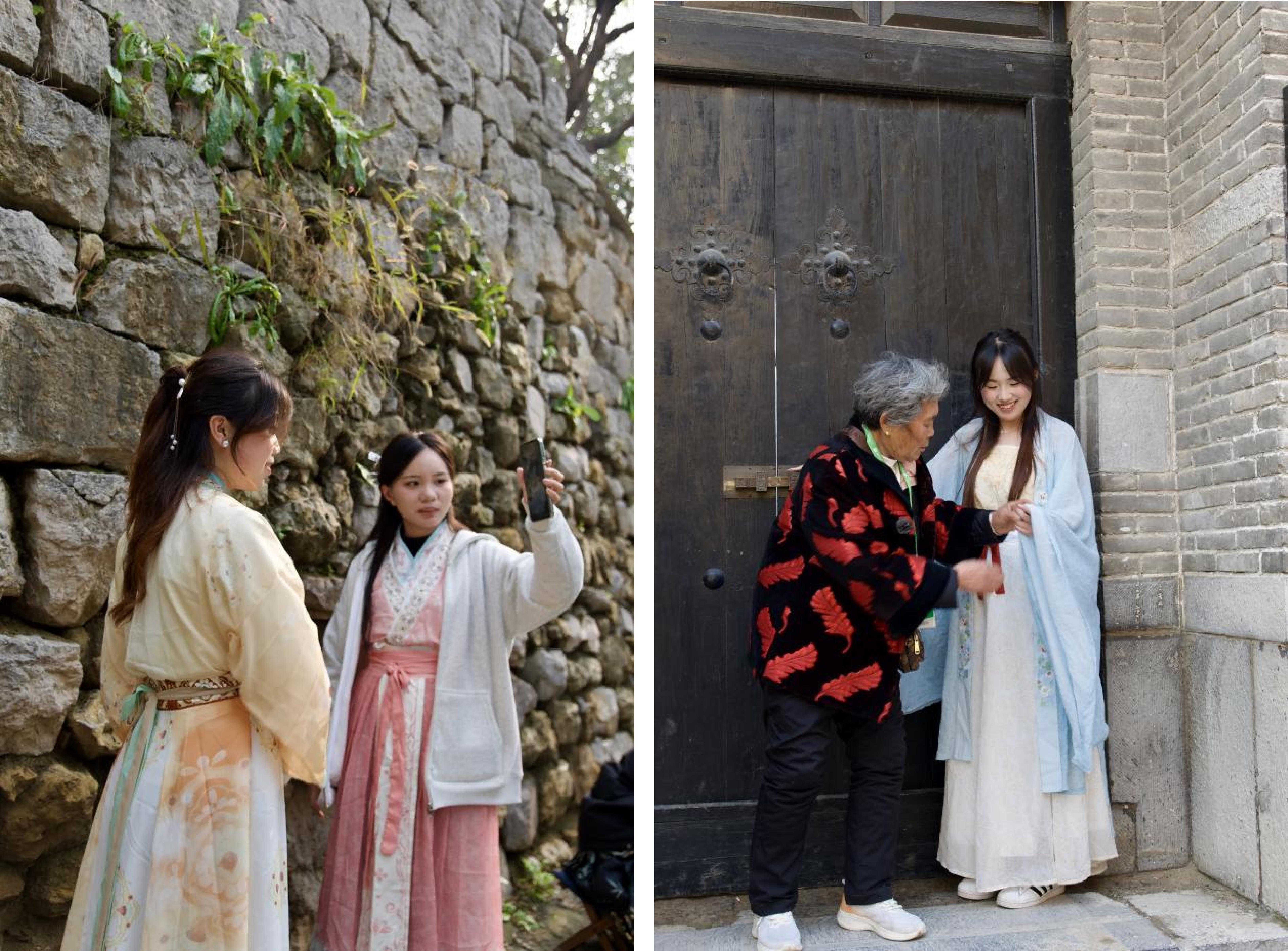 为此,本次实践课堂精心设计了古村寻踪、乡村文化记录、汉服展演、景区直播、座谈等实践环节。同学们沿着古村幽深的街巷,用脚步丈量古村历史,用影像记录乡村文化之美,用心触摸古村文化根脉。学生们身着汉服,将汉服韵味融入古村环境,将传统文化植入乡村场景。学生还化身主播,以乡村文化研究的视角,带网友“云游”古村,在“乡村旅游+新媒体运营”的融合场景中,在实时互动中提升内容策划、语言表达与临场应变能力。最后,学生与景区管理人员围绕景区产品优化、旅游营销创新等展开深度交流,学生们踊跃发言,迈出了青年学子助力乡村振兴的第一步。