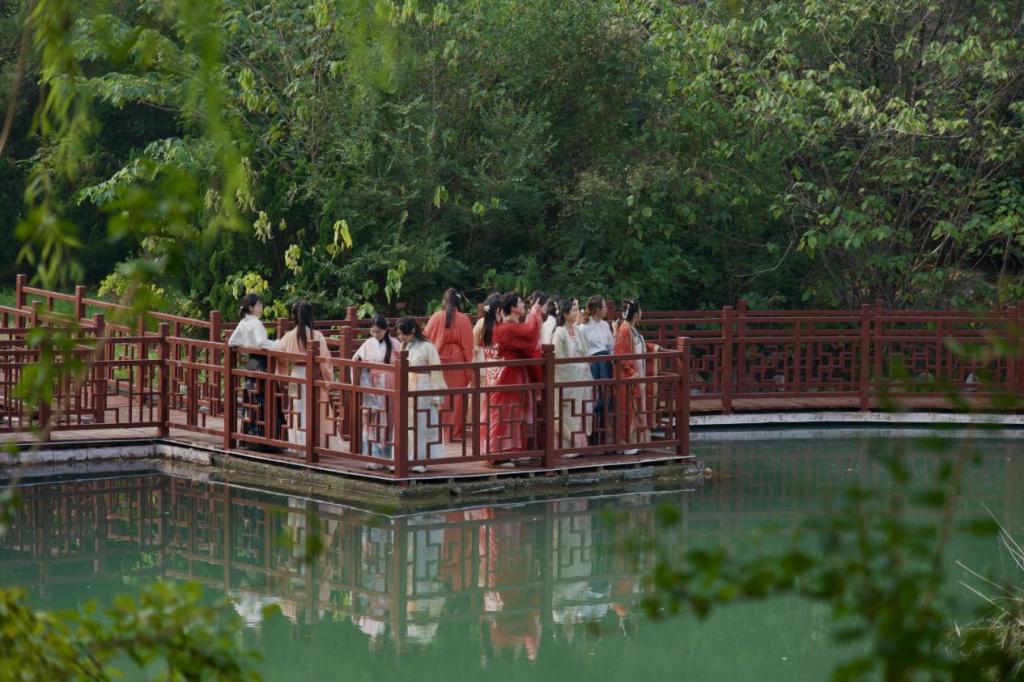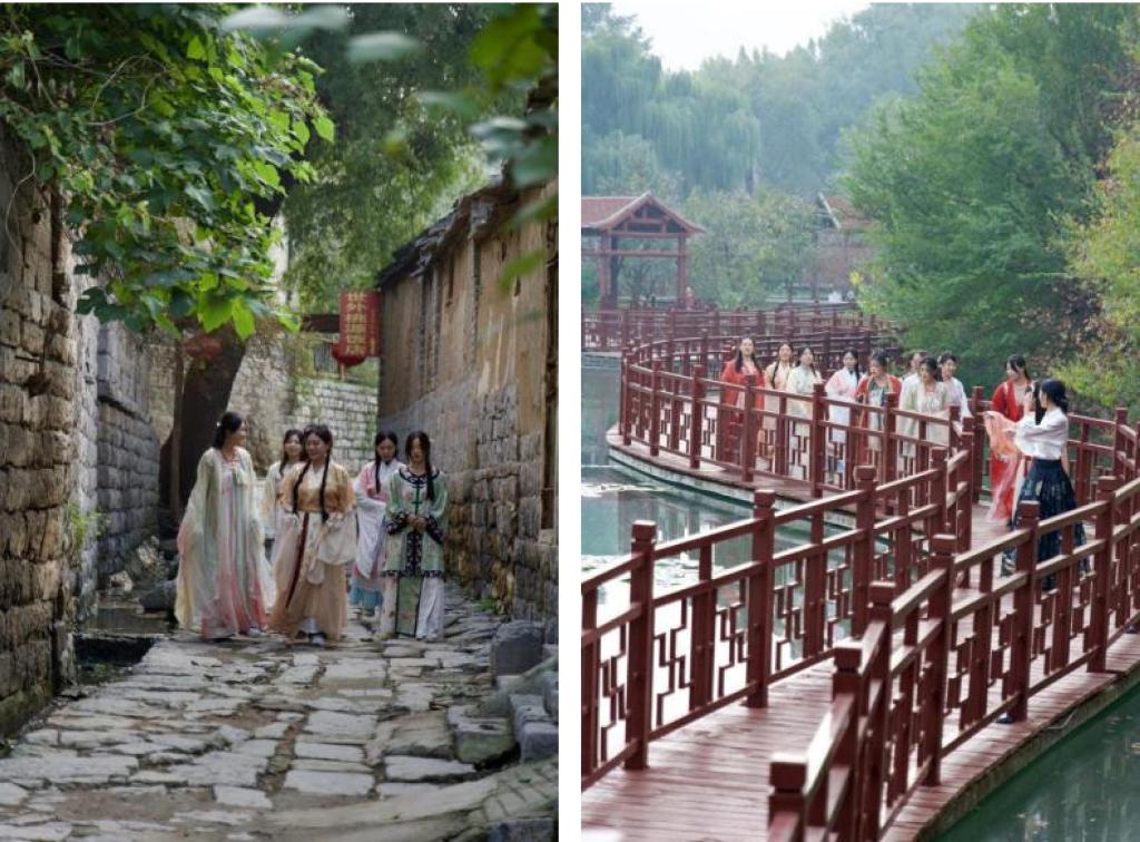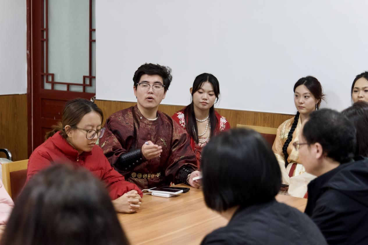 为此,本次实践课堂精心设计了古村寻踪、乡村文化记录、汉服展演、景区直播、座谈等实践环节。同学们沿着古村幽深的街巷,用脚步丈量古村历史,用影像记录乡村文化之美,用心触摸古村文化根脉。学生们身着汉服,将汉服韵味融入古村环境,将传统文化植入乡村场景。学生还化身主播,以乡村文化研究的视角,带网友“云游”古村,在“乡村旅游+新媒体运营”的融合场景中,在实时互动中提升内容策划、语言表达与临场应变能力。最后,学生与景区管理人员围绕景区产品优化、旅游营销创新等展开深度交流,学生们踊跃发言,迈出了青年学子助力乡村振兴的第一步。